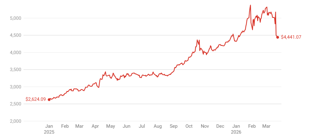 Chỉ vài tháng trước, vào cuối tháng 1/2026, giá vàng từng thiết lập đỉnh lịch sử gần 5.600 USD/ounce, gấp đôi so với cùng kỳ năm trước. Nhưng kể từ đó, kim loại quý này đã mất khoảng 20% giá trị, trượt dài ngay khi căng thẳng địa chính trị ở Trung Đông bùng phát.